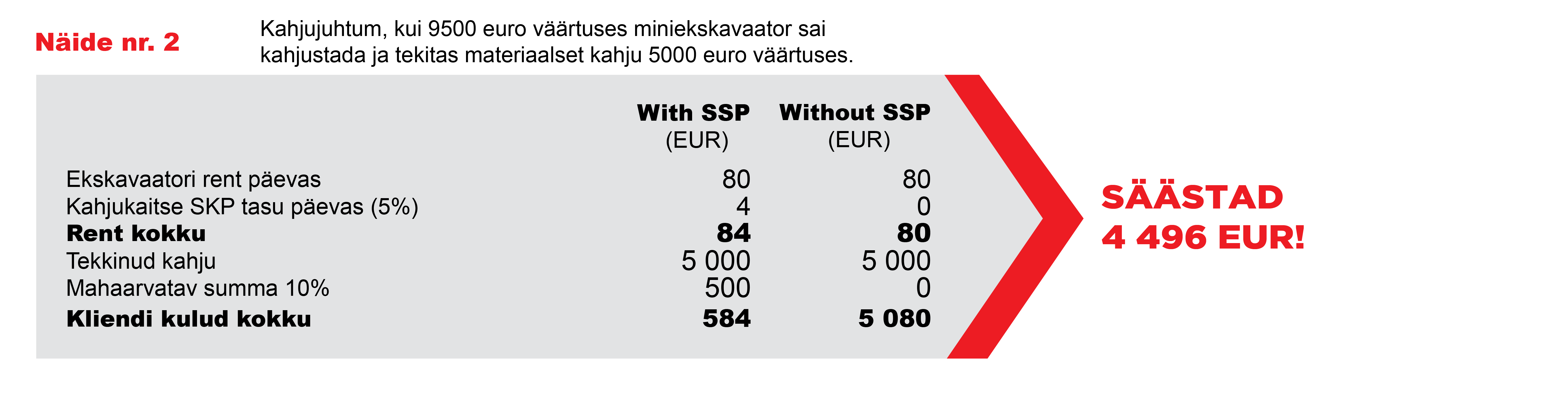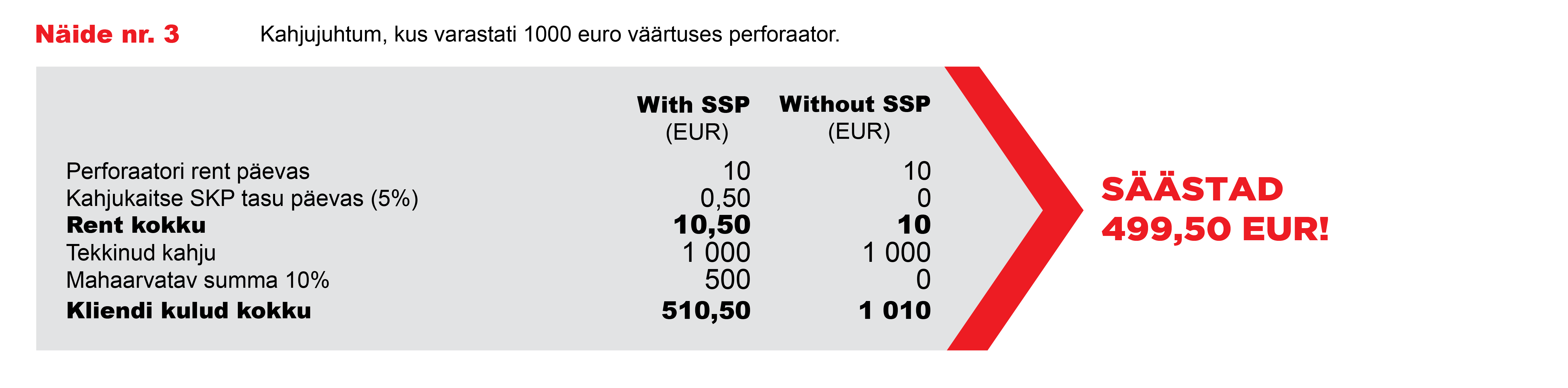 Kahjujuhtumi korral ja SKP kasutamise korral maksate rendileandjale ainult omavastutuse, mis on 10% kahju summast, kuid mitte vähem kui 500 eurot kuni 10 000 euro väärtusega seadmete puhul ja mitte vähem kui 1500 eurot üle 10 000 euro väärtusega seadmete puhul.